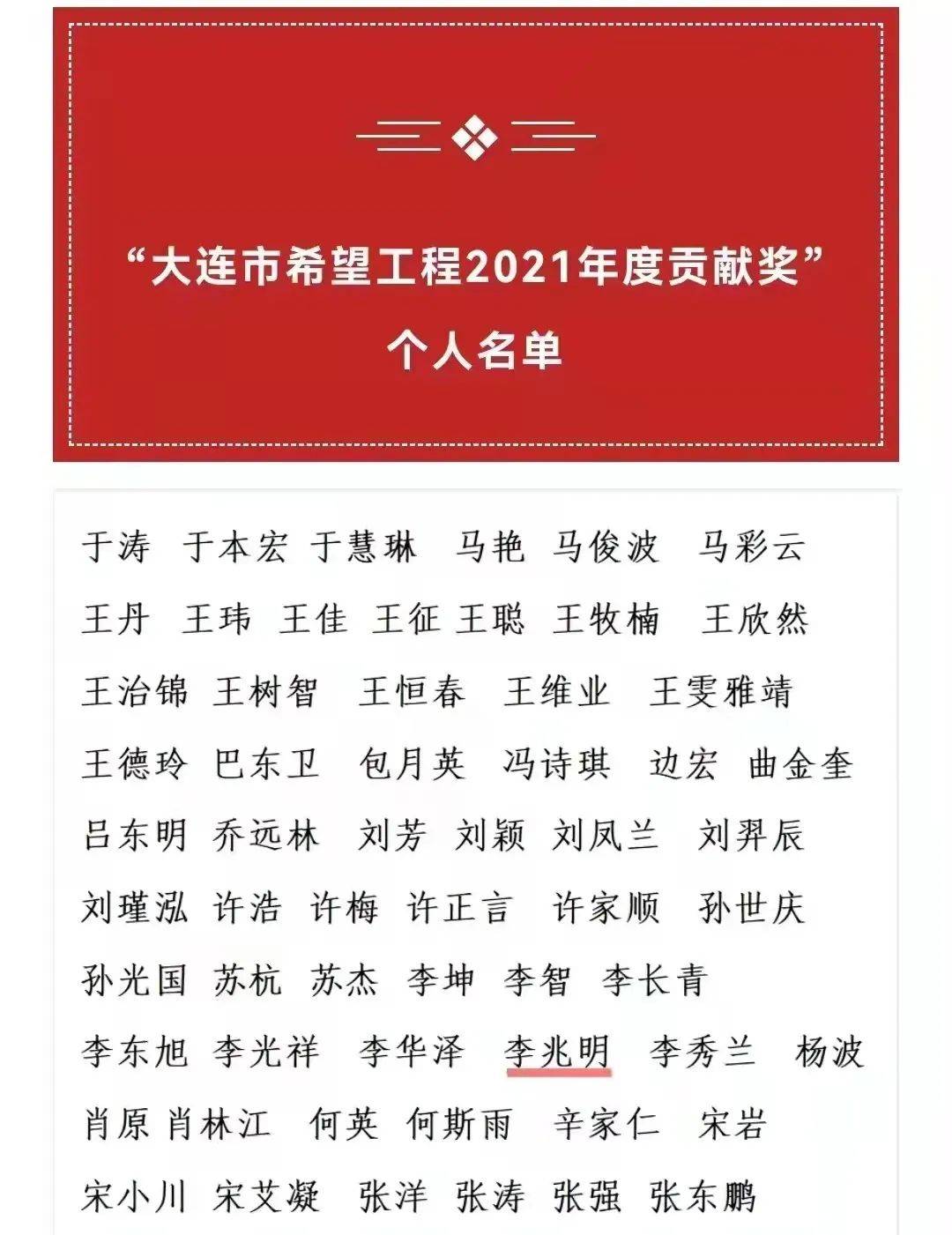 李兆明董事長此次榮獲“大連市希望工程2021年度貢獻獎”是李兆明董事長多年來堅持投身公益、不忘回報社會的一個縮影,多年來他已先后向社會公益事業(yè)捐款、捐物三百余萬元,并拿出數(shù)十萬元幫助下崗失業(yè)人員再就業(yè),被大連市慈善總會評選為“大連市慈善之星”。