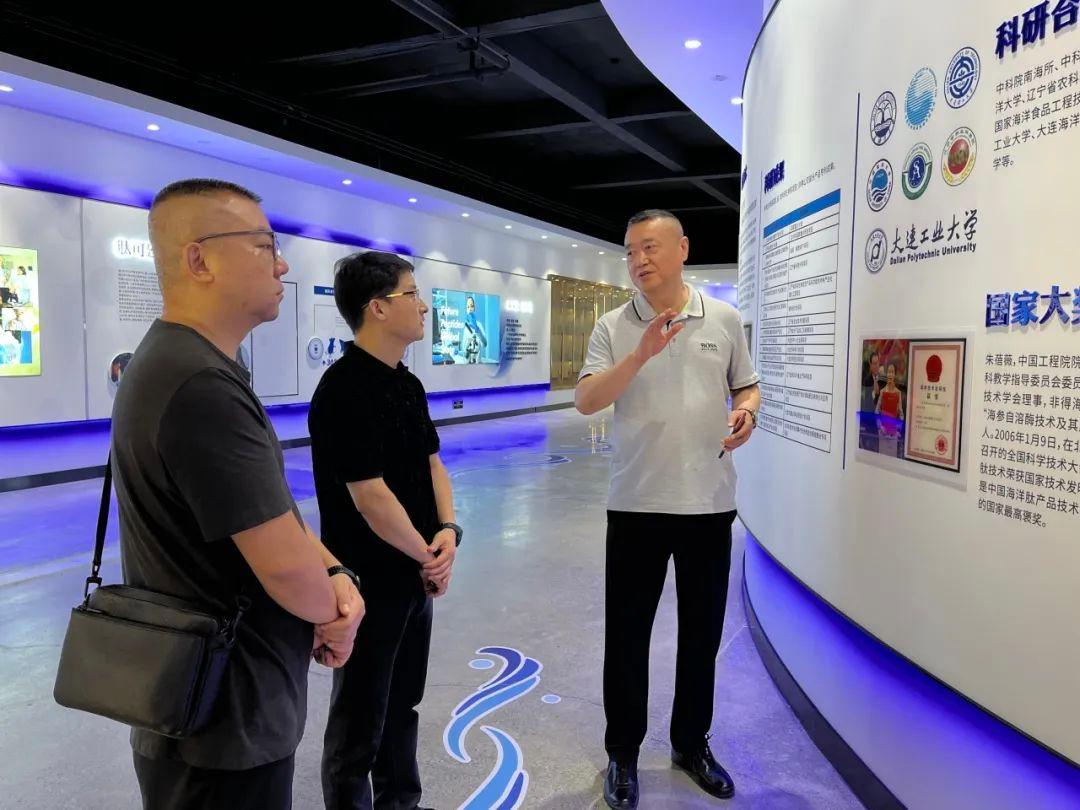 調(diào)研伊始,魏鋒會長一行在李兆明董事長和董禹常務(wù)副總經(jīng)理的引導(dǎo)下,首先參觀了大連市海洋肽與生命健康科普基地。在這里,來賓們通過詳實的展示和生動的講解,系統(tǒng)了解了海洋生物活性肽的來源、特性及其對人體健康的重要價值,對肽科技的神奇魅力有了更直觀、深刻的認(rèn)識。