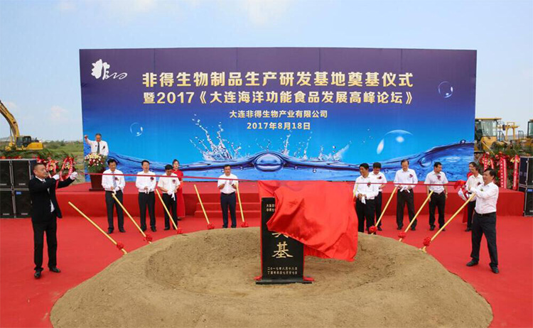 8月18日 大連非得生物產(chǎn)業(yè)有限公司非得生物制品生產(chǎn)研發(fā)基地奠基儀式在大連金普新區(qū)金州經(jīng)濟(jì)開(kāi)發(fā)區(qū)隆重舉行,市委常委、金普新區(qū)黨工委書(shū)記、管委會(huì)主任王強(qiáng),老領(lǐng)導(dǎo)、原大連市政協(xié)主席、大連海洋漁業(yè)協(xié)會(huì)會(huì)長(zhǎng)劉俊文,大連非得生物產(chǎn)業(yè)有限公司董事長(zhǎng)李兆明等相關(guān)領(lǐng)導(dǎo)及各界嘉賓200余人參加了奠基儀式。金州開(kāi)發(fā)區(qū)管委會(huì)主任毛長(zhǎng)毅代表金普新區(qū)管委會(huì)致辭。奠基儀式后,由國(guó)家海洋食品工程技術(shù)研究中心、大連工業(yè)大學(xué)和大連海洋大學(xué)聯(lián)合主辦,大連非得生物產(chǎn)業(yè)有限公司承辦的《2017大連海洋功能食品發(fā)展高峰論壇》同期舉行。
